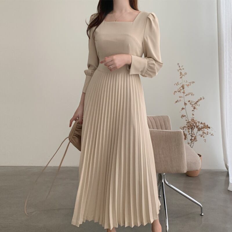 ワンピース ドレス ロング丈 長袖 5229 ボリューム袖 襟付き スクエアカラー Aライン 切り替えデザイン プリーツ 薄手 大人可愛い きれいめ シンプル 大人 上品 おしゃれ 大人女子 エレガント とろみ感 無地 春 秋 冬 入学式 入園式 卒業式 卒園式 謝恩会 2021 20代 30代 40代 レディース デート お出かけ 女子会 休日 イベント ホテル レストラン 着回し 普段使い 韓国 コーデ モテ 美脚 新作 サイズ S M L XL 色展開 ピンク アプリコット 送料無料