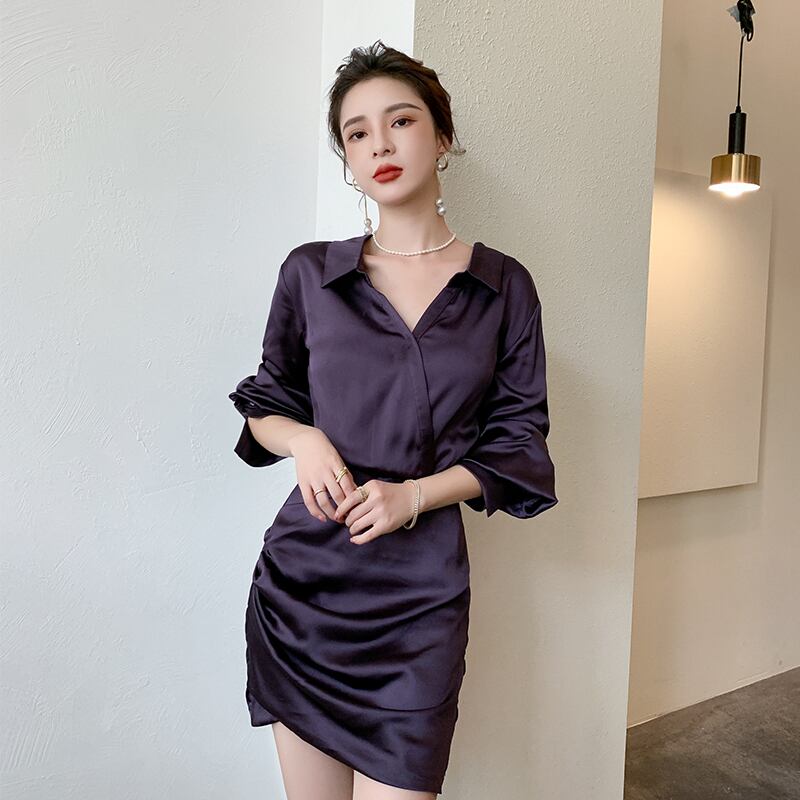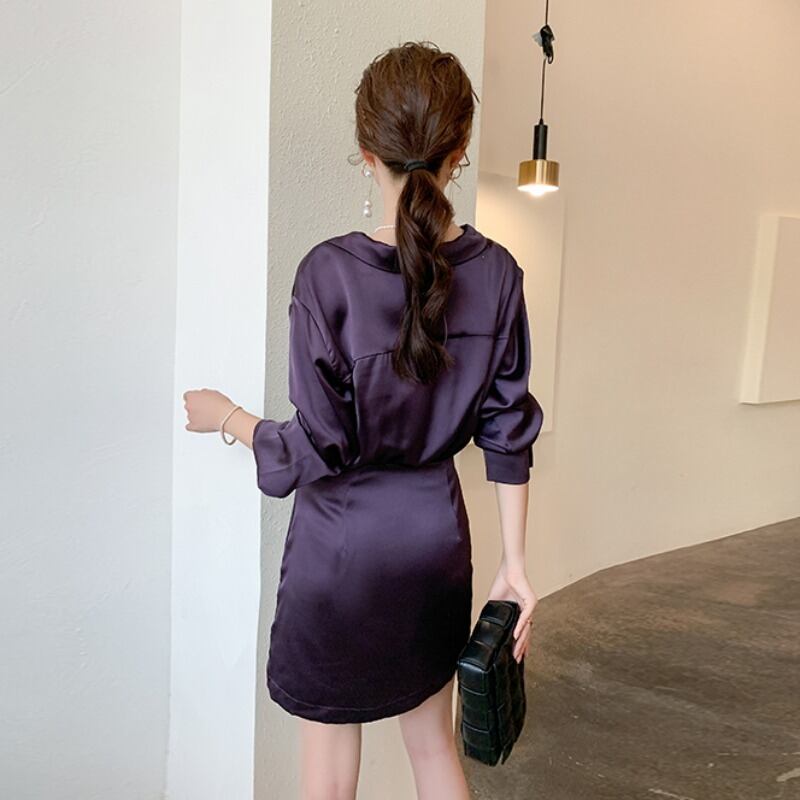 ドレス ミニ丈 袖あり 長袖 Vネック 5259 襟付き スリム アシンメトリー サテン 大人可愛い きれいめ 大人 おしゃれ 大人女子 クール モード系 セクシー エレガント とろみ感 無地 秋 冬 2021 10代 20代 レディース パーティー イベント ホテル レストラン 着回し 韓国系 ファッション モテ 美脚 脚長 新作 インスタ映え サイズ S M L XL パープル 秋カラー 送料無料