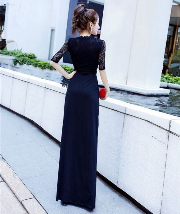 ドレス マキシ丈 袖あり 半袖 Vネック 5267 襟付き Aライン レース ウエストリボン スリット 薄手 コットン きれいめ シンプル 大人 上品 おしゃれ 大人女子 クール セクシー エレガント とろみ感 無地 春 夏 秋 20代 30代 レディース パーティー イベント ホテル レストラン 着回し 韓国系 ファッション モテ 美脚 インスタ映え サイズ S M L XL ブラック 大人カラー 送料無料