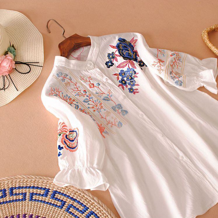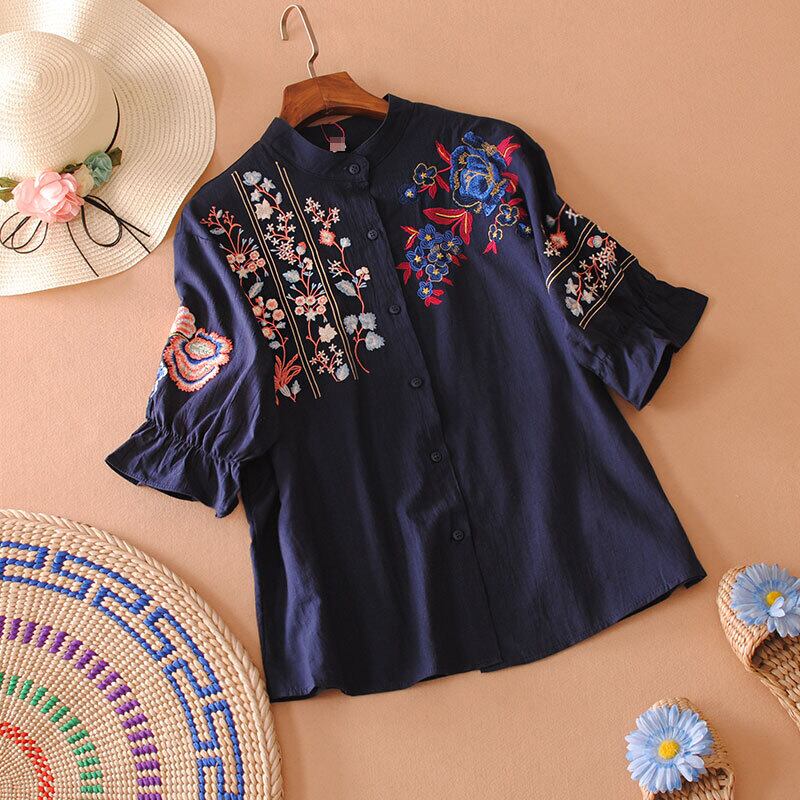 刺繍入りシャツ トップス シャツ 30030 ブラウス 袖あり 半袖 パフスリーブ スタンドカラー 前開き 綿 かわいい 大人可愛い シンプル カジュアル おしゃれ お洒落 レトロ 大人可愛い 大人女子 ラブリー キュート ガーリー 主役級 存在感 無地 フラワー 春 夏 秋 10代 20代 30代 レディース 学生 通学 デート お出かけ 女子会 休日 着回し 普段使い 重ね着 色展開 白 ホワイト ネイビー 送料無料