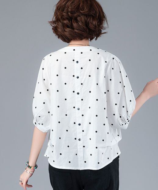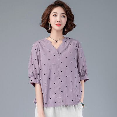 ドット柄スキッパーシャツ トップス 30035 シャツ ブラウス 袖あり 5分袖 五分袖 パフスリーブ Vネック 綿 かわいい 大人可愛い きれいめ シンプル カジュアル おしゃれ お洒落 レトロ 大人可愛い 大人女子 ラブリー キュート ガーリー 主役級 存在感 柄 ドット柄 水玉 春 夏 10代 20代 30代 レディース OL 通勤 学生 通学 デート お出かけ 女子会 休日 着回し 普段使い 重ね着 サイズ M L XL 2XL 3XL 色展開 白 ホワイト パープル イエロー 送料無料