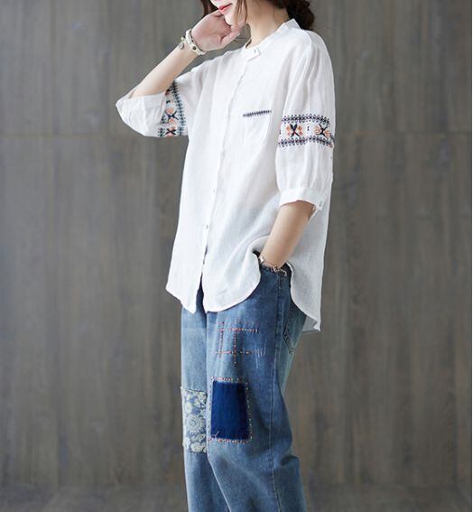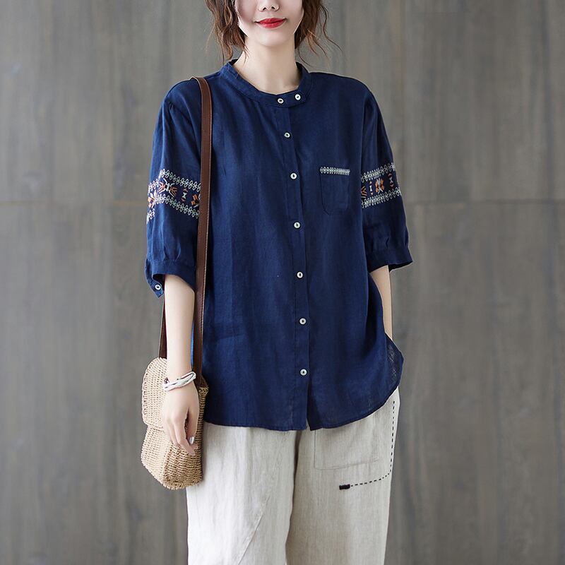 袖刺繡シャツ トップス シャツ ブラウス 30065 袖あり 半袖 スタンドカラー 刺繍 前開き 綿 かわいい 大人可愛い きれいめ シンプル カジュアル おしゃれ お洒落 かっこいい レトロ 大人可愛い 大人女子 こなれ感 ラフ ラブリー キュート ガーリー 個性的 主役級 存在感 無地 柄 春 夏 10代 20代 30代 レディース 学生 通学 デート お出かけ 女子会 休日 着回し 普段使い 重ね着 サイズ L XL 色展開 白 ホワイト ネイビー 送料無料