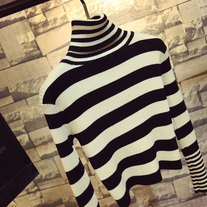 ■ショート丈のタートルネックセーターです。袖の細いストライプがアクセントに。
