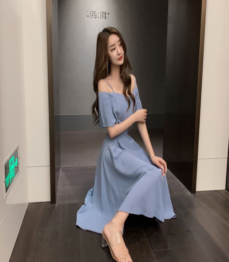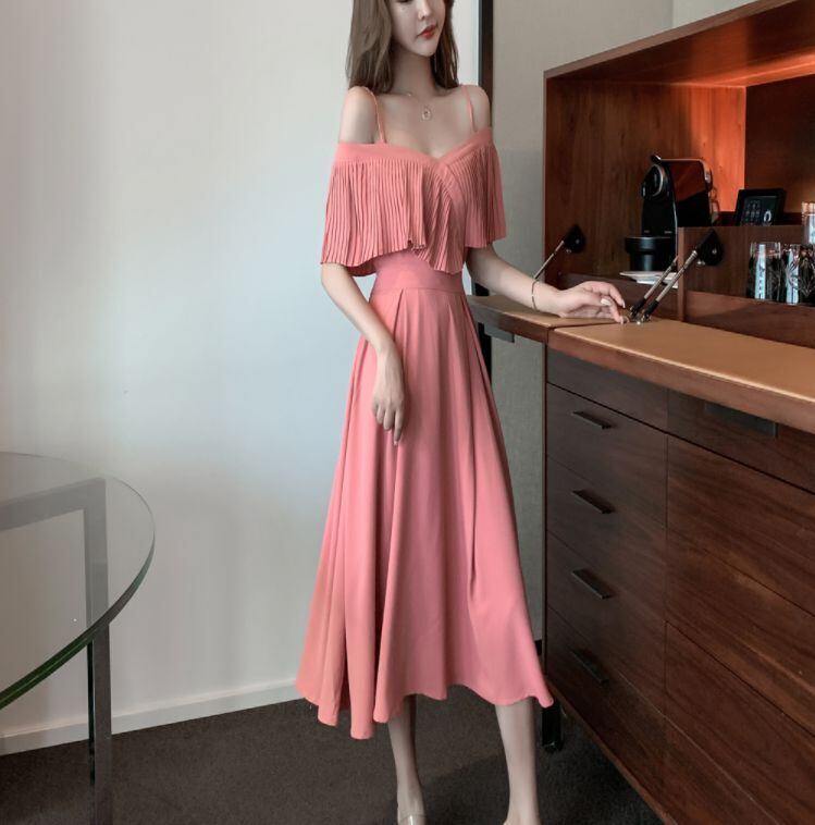 オープンショルダーがセクシーな、ミモレ丈ドレスです。スカート部分の切り替えがキュッとくびれているので、ウエストを細く見せる効果があります。パーティやイベントで一目置かれる、他には無いデザインですよ。