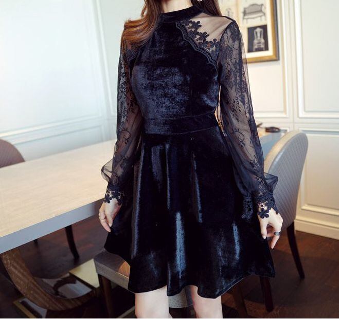 ドレス 膝丈 袖あり 長袖 襟付き スタンドカラー 5921 レース ハイウエスト 透け感 シースルー ベルベット 大人可愛い 上品 おしゃれ 大人女子 クール エレガント 存在感 小花柄 秋 冬 二次会 披露宴 2021 10代 20代 レディース パーティー イベント ホテル レストラン 着回し 韓国系 ファッション 新作 インスタ映え サイズ S M L XL 2XL ブラック 送料無料