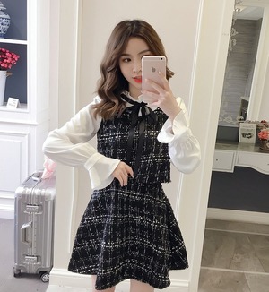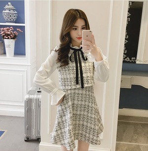 ツーピースのように見える、ブラウジングワンピースです。上品なツイード柄と、襟元のリボンがキュート!ひざ上丈で、脚長効果もありますよ。