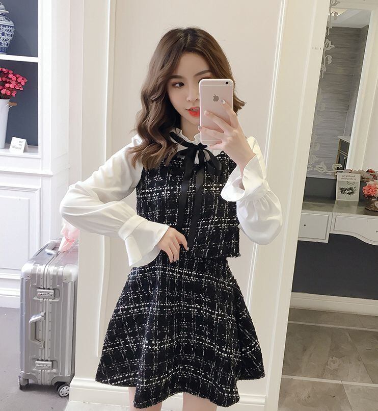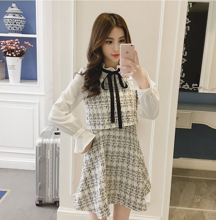 ワンピース 膝上 袖あり 長袖 5932 トランペットスリーブ 襟付き フリル襟 Aライン フリル リボン ハイウエスト かわいい 大人可愛い きれいめ 上品 おしゃれ ラブリー キュート エレガント 存在感 柄 ツイード 春 秋 冬 2020 10代 20代 レディース デート お出かけ 休日 パーティー イベント ホテル レストラン 着回し 普段使い 韓国系 ファッション モテ 脚長 トレンド インスタ映え サイズ S M L XL 色展開 ホワイト ブラック 送料無料