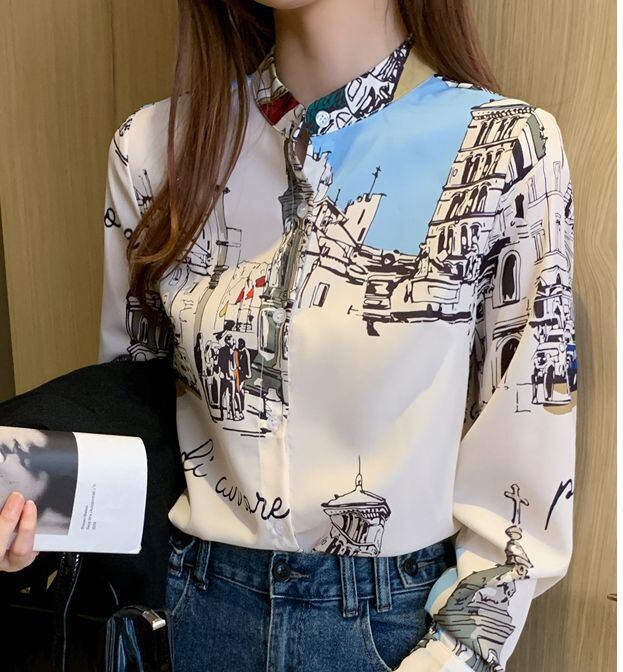 プリントシフォンシャツ トップス シャツ 30115 ブラウス 袖あり 長袖 スタンドカラー シフォン 前開き かわいい 大人可愛い きれいめ シンプル カジュアル 大人 おしゃれ お洒落 レトロ 大人可愛い 大人女子 ラブリー キュート ガーリー 個性的 主役級 存在感 柄 春 秋 10代 20代 30代 レディース 学生 通学 デート お出かけ 女子会 休日 着回し 普段使い 重ね着 サイズ S M L XL 2XL 送料無料