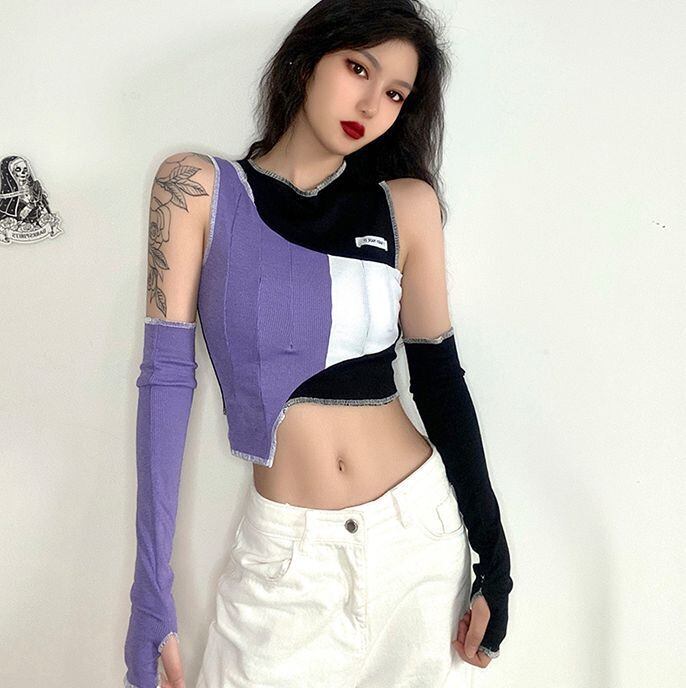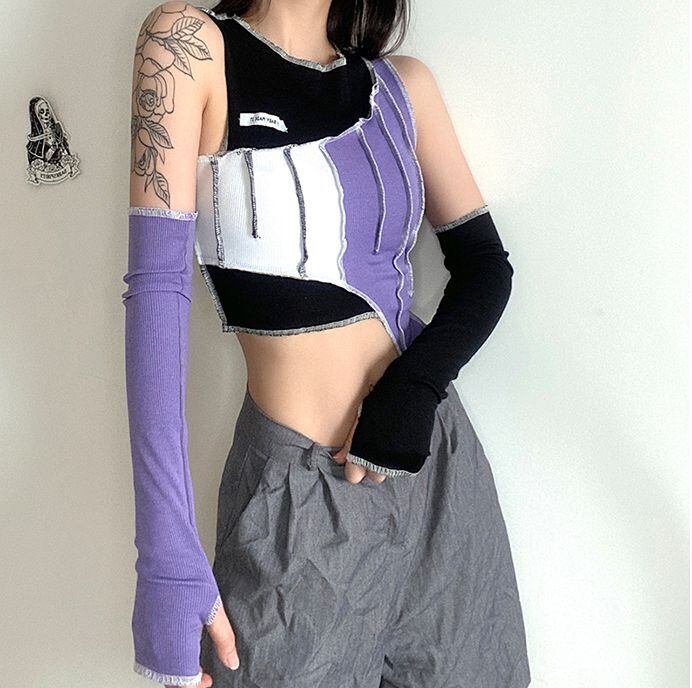 魅せる トップス Tシャツ ショート丈 3054 ノースリーブ アームカバー付き ポリエステル エキゾチック セクシー 秋 ハロウィン 10代 20代 女性用 S M L 紫 送料無料