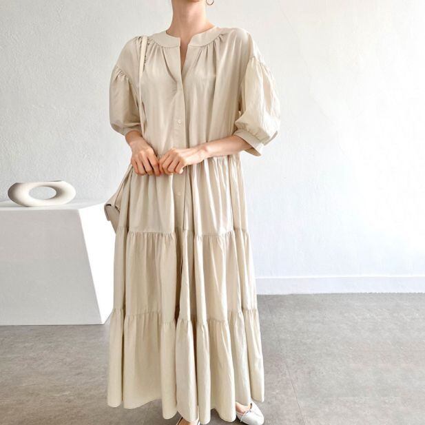 女性らしいデザインのロング丈ワンピース、袖感、裾感、ライン全てが可愛い1枚です。