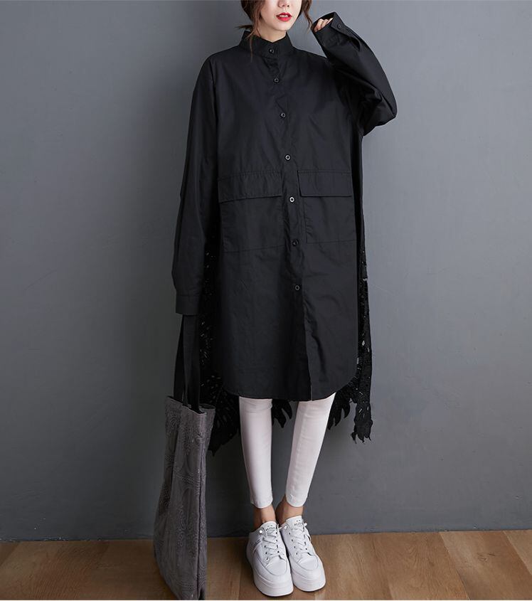 トップス シャツ ミディアム丈 袖あり 30411 長袖 襟付き POLO襟 ワイド アシンメトリー ポケット かぎ針編み 綿 大人可愛い きれいめ おしゃれ かっこいい こなれ感 ラフ ルーズ 個性的 クール モダン 無地 春 秋 2021 20代 30代 レディース ママ マタニティ デート お出かけ 休日 イベント 旅行 着回し 普段使い 韓国系 ファッション 楽ちん 体系カバー 新作 フリーサイズ 大きめ 色展開 ホワイト ブラック 送料無料