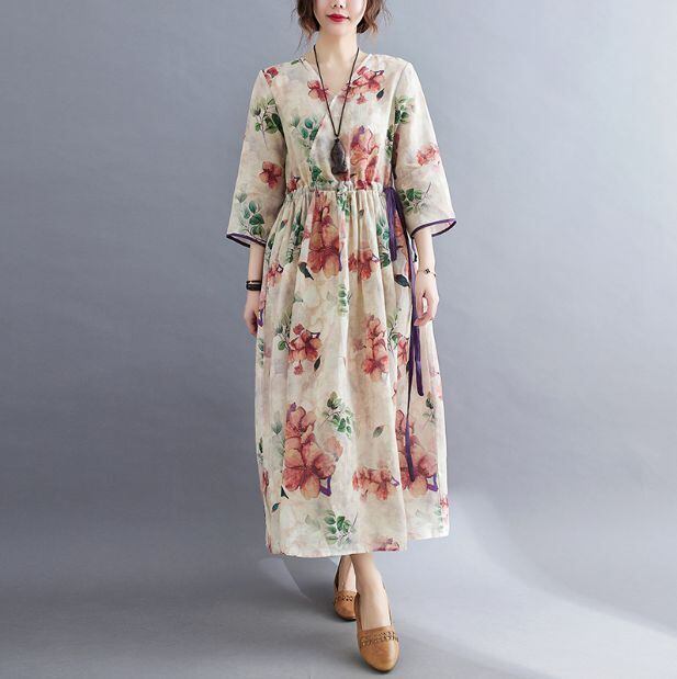 花柄ワンピース ワンピース フレアワンピース 30285 ロング ロング丈 袖あり 7分袖 七分袖 Vネック カシュクール リボン 綿 麻 リネン かわいい 大人可愛い きれいめ シンプル カジュアル おしゃれ お洒落 レトロ 大人可愛い 大人女子 ラブリー キュート ガーリー 個性的 主役級 存在感 柄 花柄 春 夏 秋 10代 20代 30代 レディース デート お出かけ 女子会 休日 着回し 普段使い 重ね着 サイズ L XL 2XL 送料無料