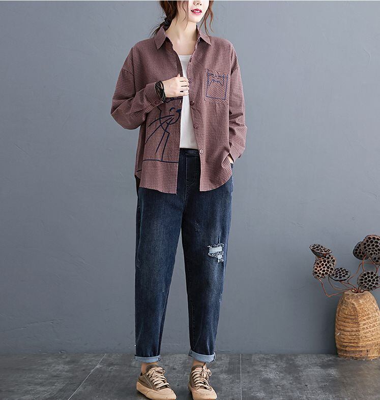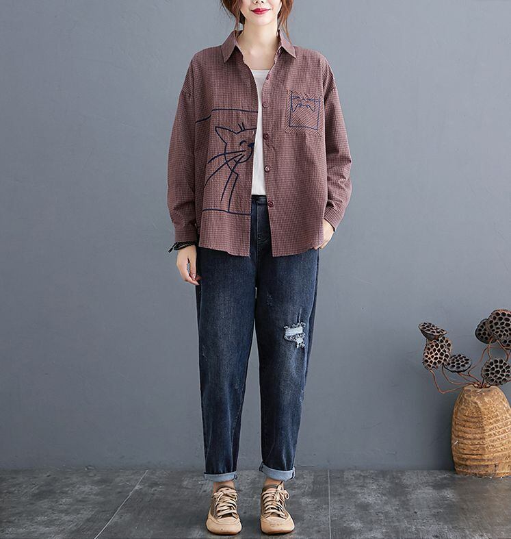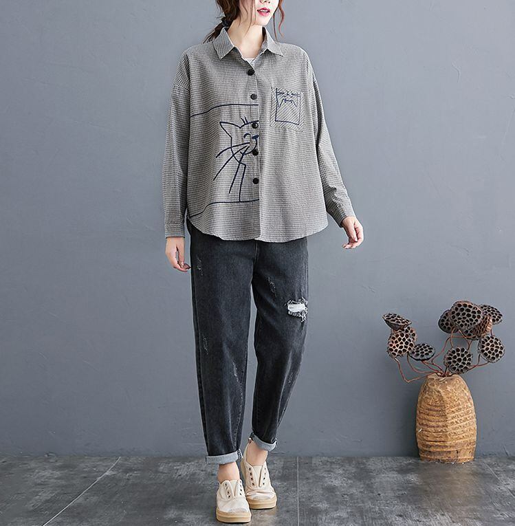 猫の刺繍がキュートな、ゆったりシャツです。大きめサイズをお探しの方におすすめ!合わせるアウターや、ボトムスを選ばない落ち着いたカラーがヘビロテに向いています。