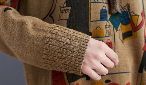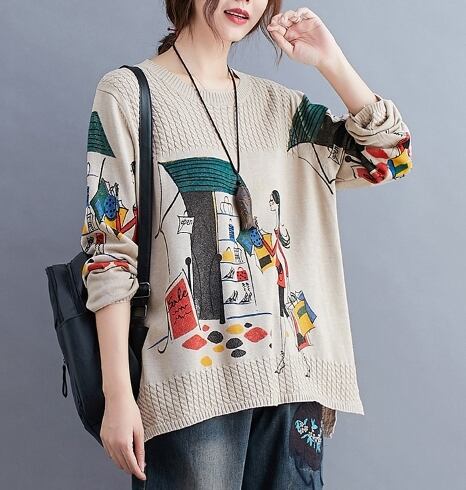 エスニックな雰囲気のある、イラストニットです。秋は1枚で、冬はアウターの中に着こむことが出来て、肌寒い季節は頼りになります。ゆったりしたつくりで動きやすいところも魅力的!