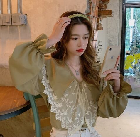 レース襟ブラウス トップス ブラウス 袖あり 30731 長袖 パフスリーブ Vネック 襟付き レース かわいい 大人可愛い シンプル カジュアル おしゃれ お洒落 レトロ 大人可愛い 大人女子 こなれ感 ラブリー キュート ガーリー 個性的 主役級 存在感 無地 春 秋 10代 20代 30代 レディース 学生 通学 デート お出かけ 女子会 休日 着回し 普段使い 重ね着 サイズ L XL 2XL 3XL 4XL 大きいサイズ 色展開 緑 グリーン 送料無料