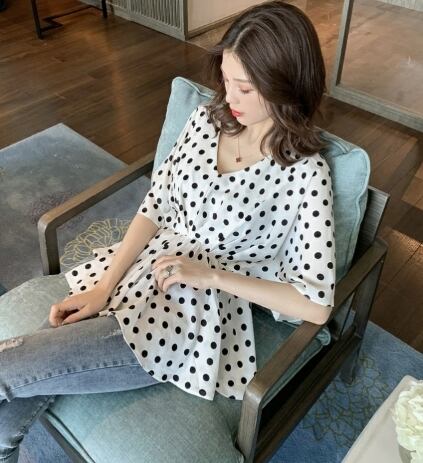 ドット柄ブラウス トップス ブラウス 袖あり 30737 7分袖 七分袖 フレアスリーブ Vネック フレア ウエストマーク ポリエステル かわいい 大人可愛い きれいめ シンプル カジュアル おしゃれ お洒落 レトロ 大人可愛い 大人女子 こなれ感 ラブリー キュート ガーリー 個性的 主役級 存在感 柄 ドット柄 水玉 春 夏 10代 20代 30代 レディース 学生 通学 デート お出かけ 女子会 休日 着回し 重ね着 サイズ M L XL 2XL 3XL 4XL 大きいサイズ ホワイト 送料無料