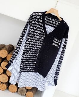 アウター カーディガン ミディアム丈 袖あり 30452 長袖 Vネック 襟付き セミフレア ドッキング ポリエステル 大人可愛い カジュアル おしゃれ かっこいい こなれ感 ラフ 存在感 柄 ストライプ 2021 20代 30代 レディース デート お出かけ 休日 旅行 着回し 普段使い 重ね着 韓国系 ファッション 楽ちん 新作 インスタ映え フリーサイズ ネイビー 送料無料