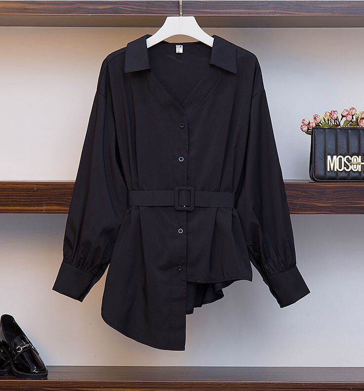 ふくよかなレディのための、アシメントリーなペプラムスタイリッシュなブラウス。アクセントのベルトがスタイルをぐっと引き締める効果が!Vカットの襟ぐりもフェイスラインをすっきりと見せてくれます。