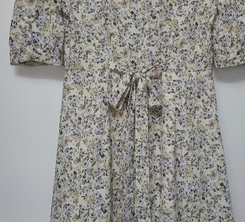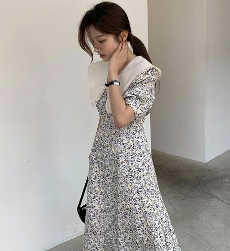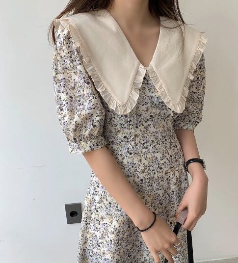 大きな襟がとても印象的な花柄ワンピースです。女性らしいシルエットの1枚です。