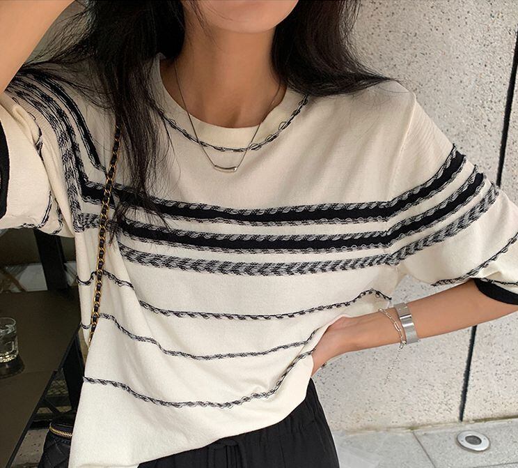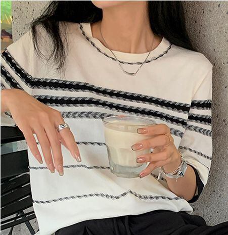 トップス Tシャツ ミディアム丈 袖あり 30459 5分袖 ラウンドネック 襟付き ストレート ステッチ 薄手 大人可愛い きれいめ シンプル カジュアル おしゃれ 大人女子 こなれ感 ラフ 抜け感 柄 ストライプ 2021 10代 20代 レディース デート お出かけ 女子会 休日 イベント 旅行 着回し 普段使い 韓国系 ファッション モテ 新作 定番 インスタ映え サイズ S M 色展開 オフホワイト ブラック 送料無料