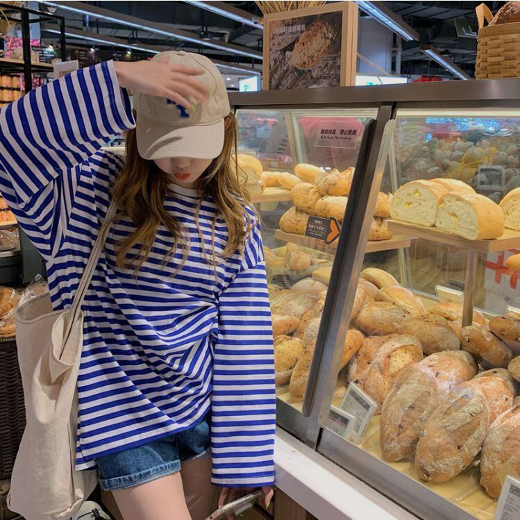 トップス Tシャツ ミディアム丈 袖あり 30461 長袖 ラウンドネック 襟付き ストレート 綿 薄手 大人可愛い きれいめ シンプル カジュアル おしゃれ 大人女子 こなれ感 ラフ ガーリー ルーズ 柄 ストライプ 春 夏 2021 10代 20代 レディース デート お出かけ 休日 イベント 旅行 着回し 普段使い 韓国系 ファッション 楽ちん モテ 新作 トレンド インスタ映え サイズ M L ブルー 送料無料