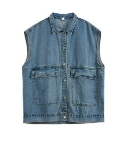 アウター ベスト ミディアム丈 袖なし 襟付き 30498 POLO襟 ストレート ポケット 前開き ポリエステル ブルーデニム シンプル カジュアル おしゃれ かっこいい ラフ メンズライク ボーイッシュ ルーズ 個性的 無地 春 秋 2021 10代 20代 レディース 学生 デート お出かけ 休日 イベント 旅行 着回し 普段使い 重ね着 韓国系 ファッション 楽ちん 体系カバー 新作 トレンド インスタ映え フリーサイズ ゆる ブルー 送料無料