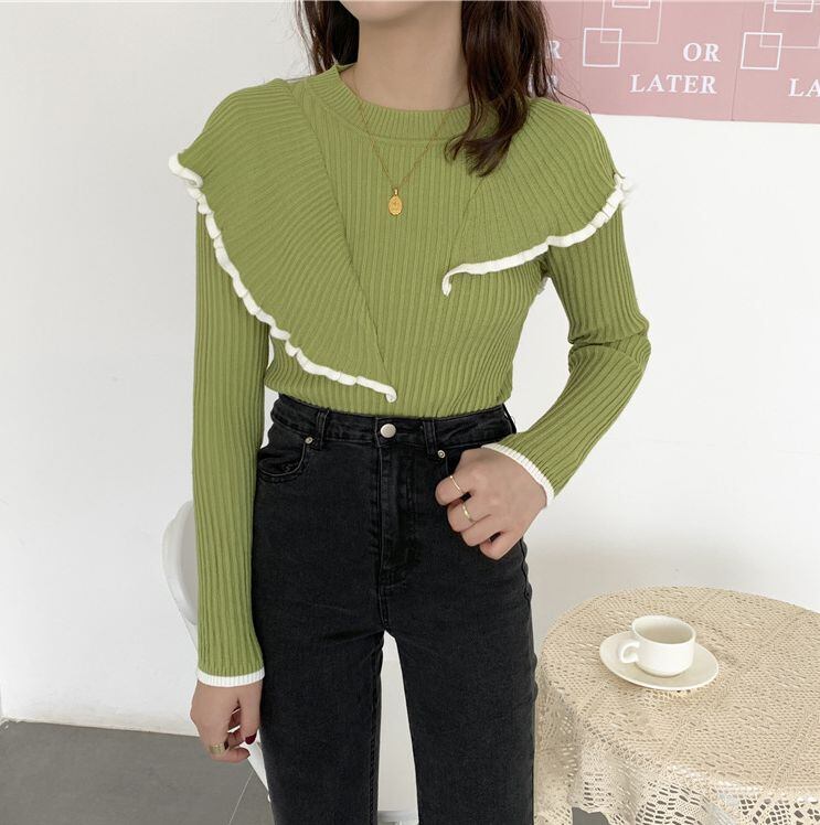配色ニットトップス ニットソー セーター 袖あり 20846 長袖 フリル リブニット かわいい 大人可愛い シンプル カジュアル 大人 おしゃれ お洒落 レトロ 大人可愛い 大人女子 こなれ感 ラフ ラブリー キュート ガーリー ルーズ 主役級 存在感 無地 秋 冬 10代 20代 30代 レディース 学生 通学 デート お出かけ 女子会 休日 着回し 普段使い 重ね着 韓国 韓国系 サイズ S M L XL 色展開 茶色 ブラウン アプリコット 送料無料
