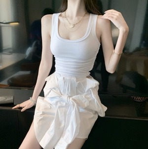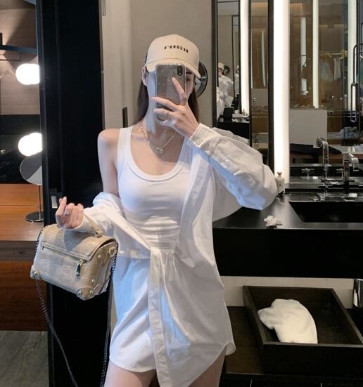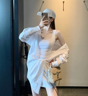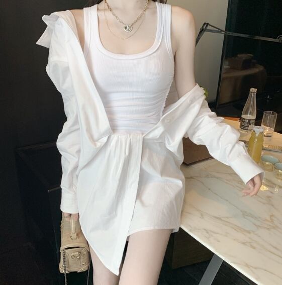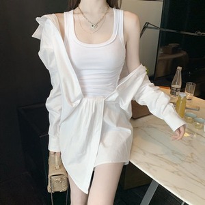 タンクトップにシャツをレイヤードした旬のデザインです。