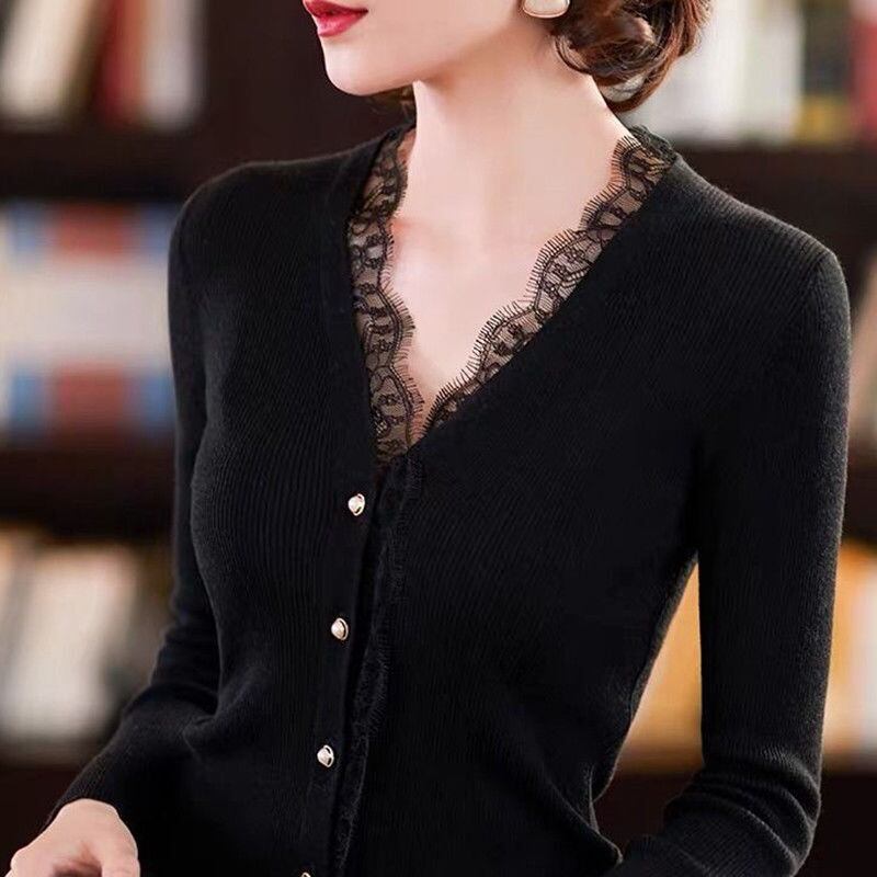 トップス カーディガン ミディアム丈 袖あり 7596 長袖 Vネック 襟付き スリム レース 綿 ビニロン きれいめ シンプル 上品 おしゃれ 大人女子 クール セクシー エレガント モダン 無地 秋 冬 二次会 2021 20代 30代 レディース OL デート お出かけ 女子会 休日 パーティー イベント ホテル レストラン 着回し 普段使い 韓国系 ファッション モテ 新作 インスタ映え サイズ S M XL ブラック 送料無料