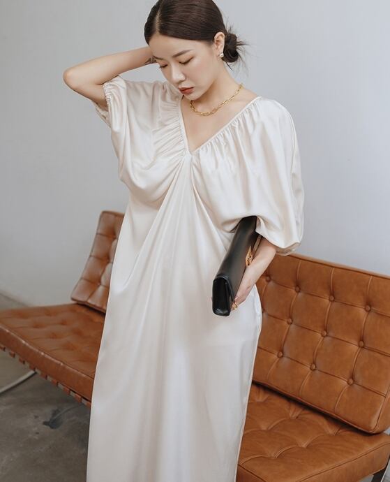 エレガントかつフェミニンさを際立たせてくれる立体的なロング丈のワンピースドレスです。