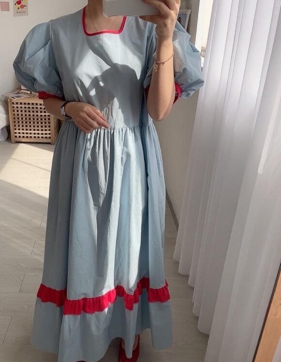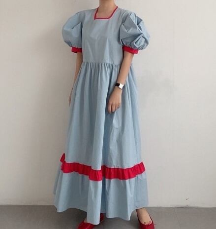 パフスリーブの縁取りとスカートのラインがポイントのロングスカートワンピースです。