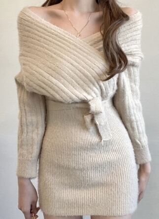 前後Vネックになっており、オフショルでも普通に着用できるのがポイントのシンプルなニットのタイトワンピ。