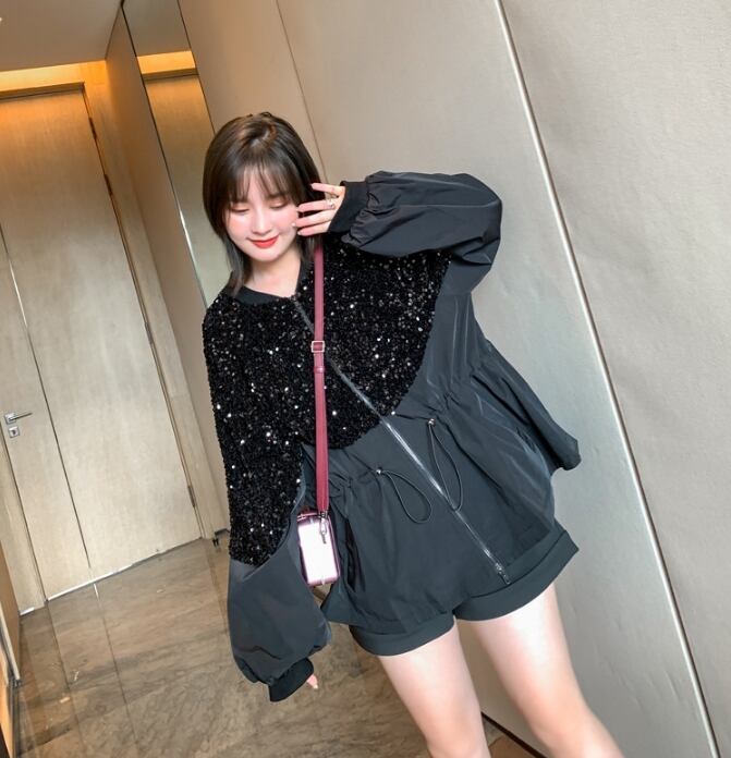 スパンコールブルゾン アウター ブルゾン ジャケット 23865 袖あり 長袖 スタンドカラー 前開き かわいい 大人可愛い シンプル カジュアル 大人 おしゃれ お洒落 レトロ 大人可愛い 大人女子 こなれ感 ラブリー キュート ガーリー 個性的 主役級 存在感 無地 秋 冬 10代 20代 30代 レディース 学生 通学 デート お出かけ 女子会 休日 着回し 普段使い 重ね着 韓国 韓国系 サイズ M L XL 2XL 3XL 色展開 黒 ブラック 送料無料