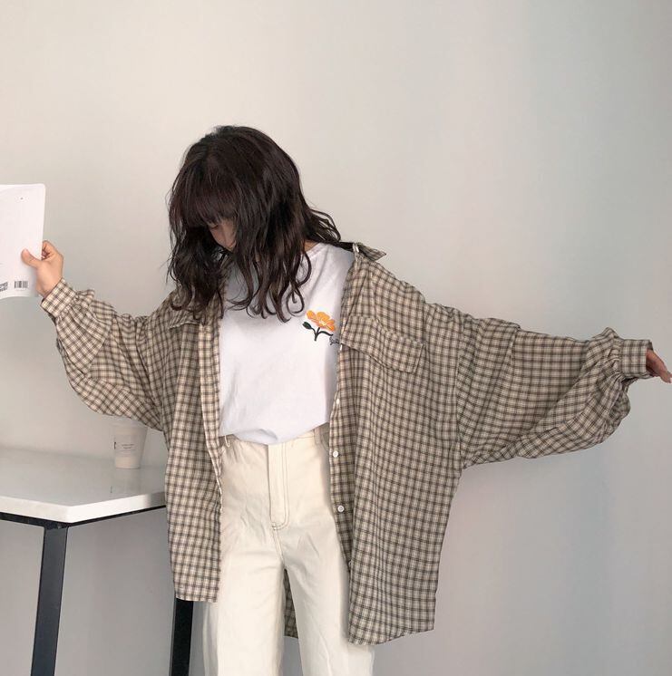 トップス アウター シャツ ミディアム丈 袖あり 5626 長袖 萌袖 襟付き POLO襟 ストレート 前開き 綿 薄手 かわいい シンプル カジュアル おしゃれ こなれ感 ラフ ボーイッシュ ガーリー ルーズ 抜け感 チェック柄 春 秋 2020 10代 20代 レディース 学生 デート お出かけ 休日 旅行 着回し 普段使い 重ね着 韓国系 ファッション 楽ちん モテ 体系カバー 定番 トレンド フリーサイズ グレー 送料無料