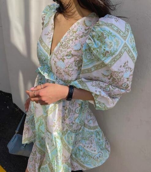 ワンピース ショート丈 袖あり 半袖 22231 パフスリーブ Vネック 襟付き Aライン シフォン フリル 薄手 かわいい 大人可愛い おしゃれ レトロ 大人女子 ラブリー キュート ガーリー セクシー 幾何学模様 春 夏 2021 10代 20代 レディース デート お出かけ 女子会 休日 イベント リゾート 旅行 着回し 普段使い オルチャン ファッション モテ 美脚 新作 トレンド インスタ映え フリーサイズ 色展開 グリーン ピンク 送料無料