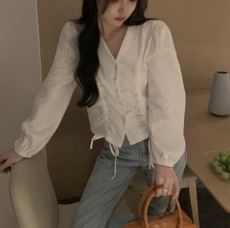 Ⅴネックブラウス トップス ブラウス 袖あり 30525 長袖 Vネック リボン 前開き 綿 かわいい 大人可愛い きれいめ シンプル カジュアル 大人 おしゃれ お洒落 レトロ 大人可愛い 大人女子 こなれ感 ラブリー キュート ガーリー 個性的 主役級 存在感 無地 春 秋 10代 20代 30代 レディース 学生 通学 デート お出かけ 女子会 休日 着回し 普段使い 重ね着 韓国 韓国系 色展開 白 ホワイト カーキ 送料無料