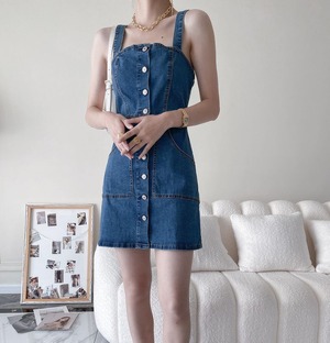 ワンピース サロペット ミニ丈 ノースリーブ 25006 Vネック Iライン ハイウエスト ブルーデニム コットン 大人可愛い きれいめ シンプル カジュアル おしゃれ 大人女子 こなれ感 ラフ キュート 存在感 無地 春 夏 2021 10代 20代 レディース デート お出かけ 休日 イベント リゾート 旅行 着回し 普段使い 重ね着 オルチャン ファッション モテ 美脚 脚長 新作 トレンド インスタ映え サイズ S M ブルー 送料無料
