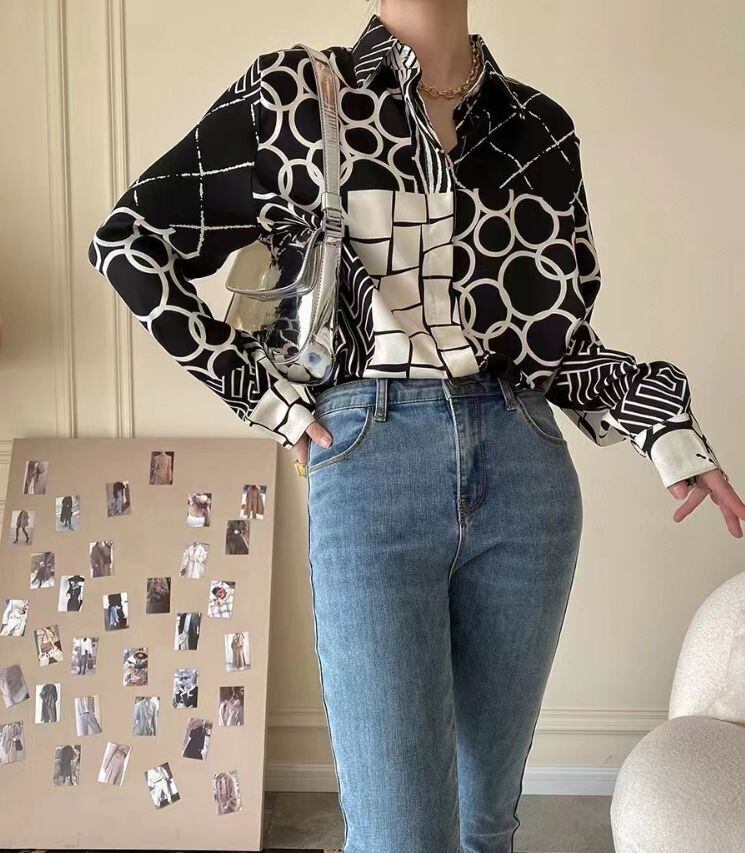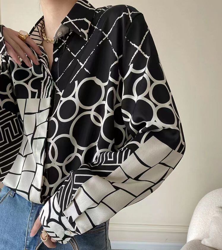 幾何学模様シャツ トップス 長袖 襟付き 25019 ゆったり シンプル お洒落 柄 アニマル柄 春 秋 冬 レディース お出かけ 公園 休日 普段使い 楽ちん ワンサイズ ブラック ホワイト 送料無料