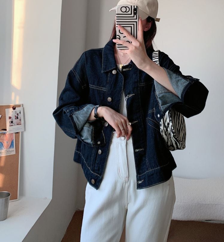 コットンデニムのジャケットです。伸縮性はないですが、シンプルなデザインで、着回ししやすいです。
