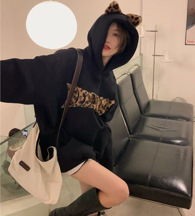 キャッチーなプリントと耳付きのフードが目を惹くパーカー。