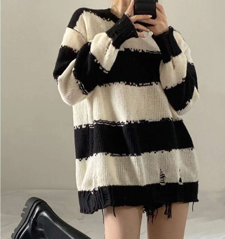 黒白のボーダー×ダメージ加工デザインがアクセントになるニットプルオーバー♪