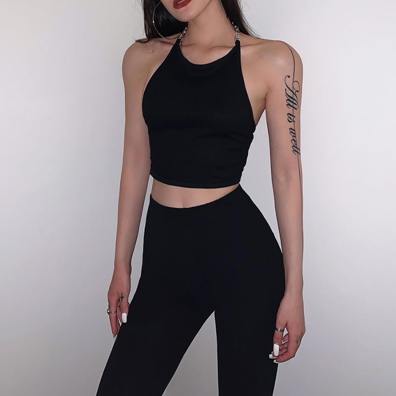 トップス キャミソール ショート丈 3072 ノースリーブ ホルターネック タイト チェーン ポリエステル 薄手 おしゃれ かっこいい 大人女子 こなれ感 個性的 クール セクシー 主役級 存在感 抜け感 ストリート系 無地 春 夏 2021 10代 20代 レディース パーティー イベント リゾート 海 プール 着回し 重ね着 新作 インスタ映え サイズ S M L ブラック 送料無料