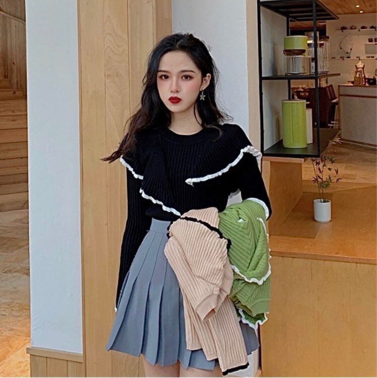 配色フリルニット トップス セーター 30689 袖あり 長袖 ラウンドネック フリル かわいい 大人可愛い きれいめ シンプル カジュアル 大人 おしゃれ お洒落 かっこいい エスニック エキゾチック 大人可愛い 大人女子 こなれ感 ラブリー キュート ガーリー 主役級 存在感 無地 秋 冬 10代 20代 30代 レディース 学生 通学 デート お出かけ 女子会 休日 着回し 普段使い 重ね着 韓国 韓国系 色展開 黒 ブラック 緑 グリーン アプリコット 送料無料