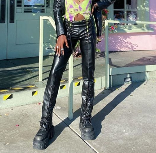 ストリートファッションの定番アイテム、ブラックレザーパンツです。ウエストがレースアップで、かなりセクシーなデザインになっています。タイトなシルエットが、美脚に見せてくれますよ。