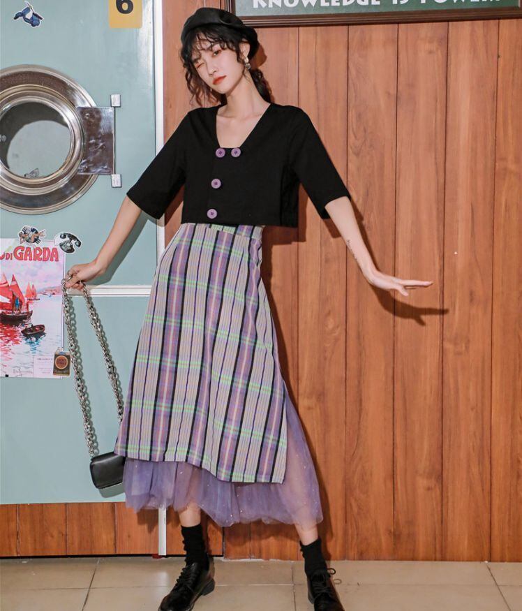 チュールがドッキングされた、チェック柄のひざ下丈スカートです。甘いスタイルも、辛口スタイルにも着まわせる、便利なアイテム!アイドルの衣裳の様な華やかさで、主役になれること間違いなしです。