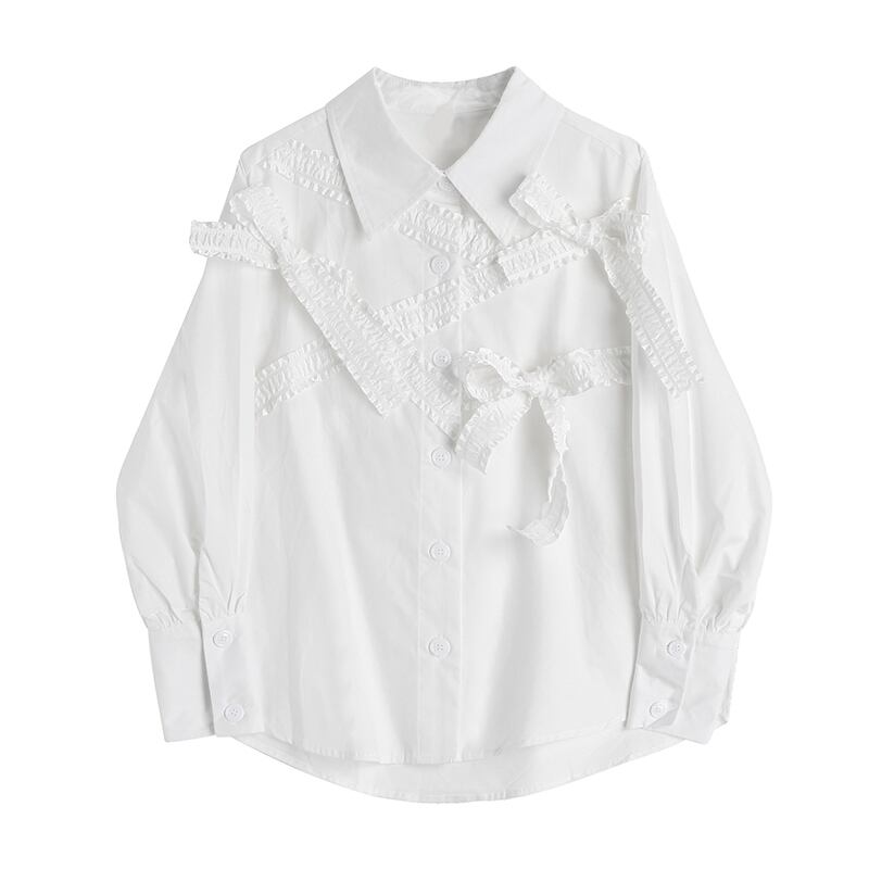 トップス シャツ ミディアム丈 袖あり 30934 長袖 襟付き POLO襟 ストレート リボン 薄手 かわいい 大人可愛い きれいめ シンプル おしゃれ ラブリー キュート ガーリー 存在感 無地 春 秋 2021 10代 20代 レディース 学生 デート お出かけ 女子会 休日 イベント 着回し 普段使い 重ね着 モテ 新作 インスタ映え フレンチスタイル サイズ S M ホワイト 送料無料