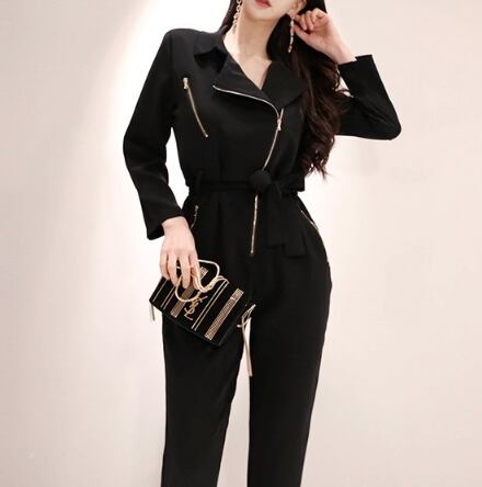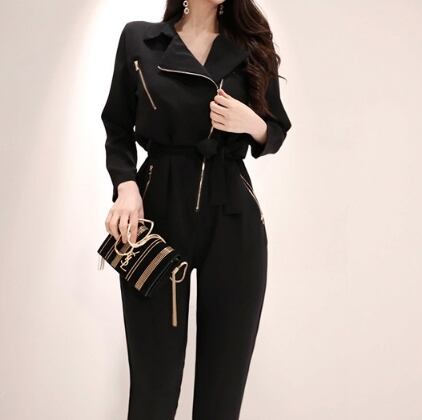 送料無料 オールインワン レディース 韓国系 Vネック ハイウエスト ウエストリボン ジッパー レトロ クール 細身 長袖 大人可愛い きれいめ シンプル おしゃれ お洒落 20代 30代 40代 脚長 通勤 通学 オフィス OL デイリー 普段着 インスタ映え 黒 S M L XL 50603