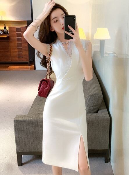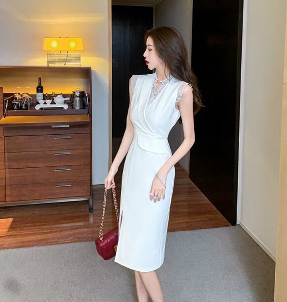 送料無料 ワンピース ワンピドレス Vネック レース ノースリーブ ロング丈 膝丈 スリット スリム Iライン 大人可愛い きれいめ レトロ シンプル おしゃれ フェミニン 上品 普段使い デイリー使い 休日 お出かけ デート 女子会 存在感 主役級 無地 春 10代 20代 30代 40代 韓国系 脚長 S M L 白 50605