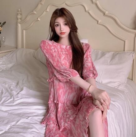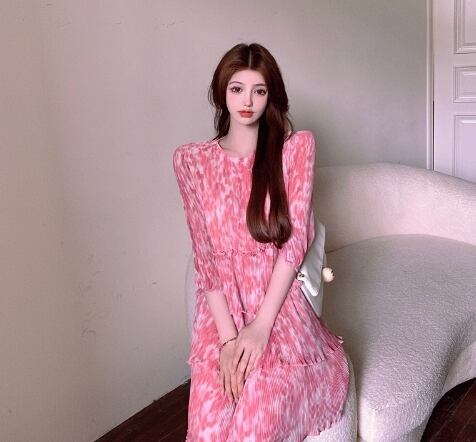 ワンピース ひざ丈 50017 膝丈 袖あり Aライン フリル 大人可愛い レトロ エレガント おしゃれ 主役級 上品 柄 春 夏 秋 誕生日 披露宴 二次会 謝恩会 20代 30代 40代 休日 パーティー 女子会 学生 デート 普段使い 韓国系 インスタ映え フリーサイズ ピンク 送料無料