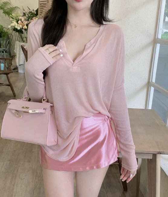 トップス シャツ 50064 長袖 Vネック かわいい ガーリー キュート ラブリー セクシー 存在感 無地 春 秋 20代 30代 デート 休日 お出かけ 女子会 ワンサイズ ピンク 送料無料